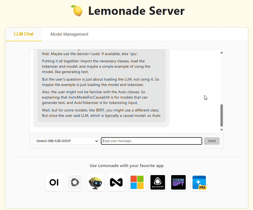 Lemonade Server focuses on easy installation and hardware auto-configuration, specifically for Windows. It promises to get users running local AI in minutes with optimizations for GPUs and NPUs.
