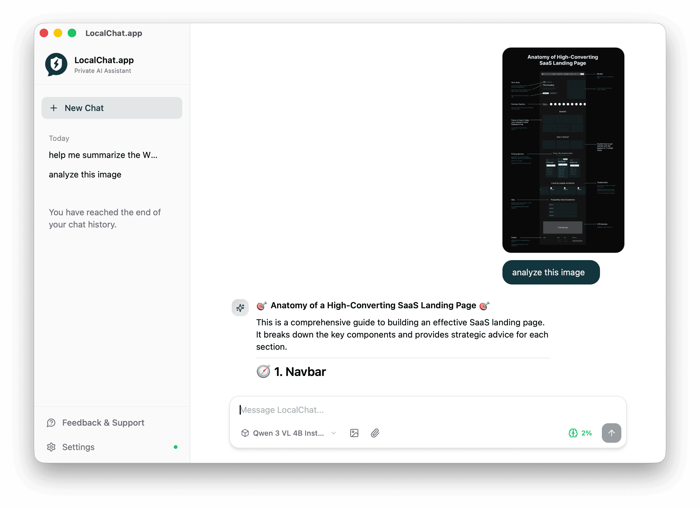LocalChat can analyze images using vision-enabled AI models. Ask questions about photos, screenshots, diagrams, or any visual content - all processed locally on your Mac.
