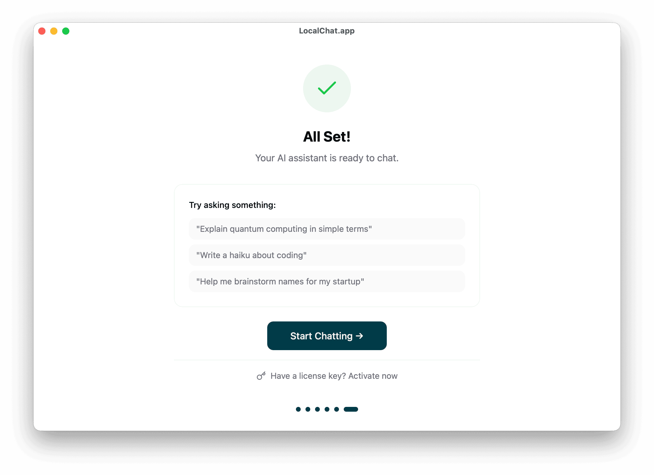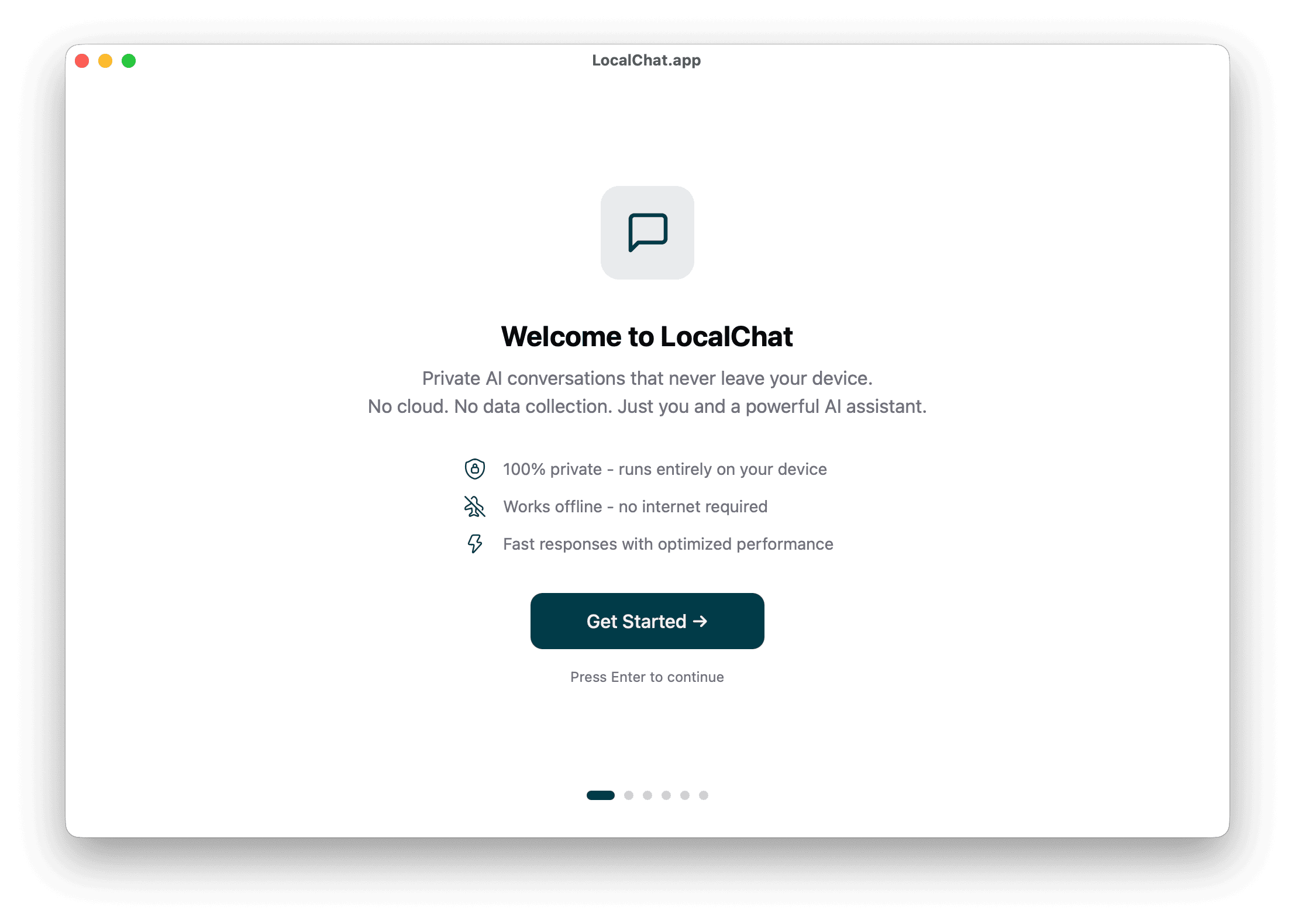 When you first launch LocalChat, you'll see the welcome screen. It introduces the key benefits:
