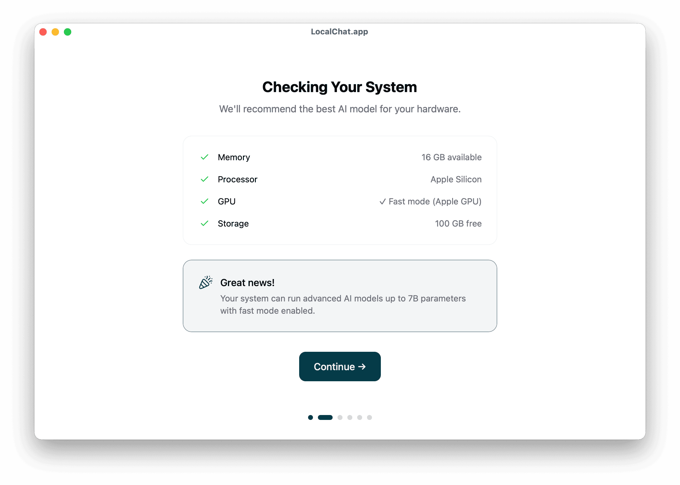 LocalChat automatically checks your Mac's capabilities to recommend the best AI model for your hardware. The check looks at: