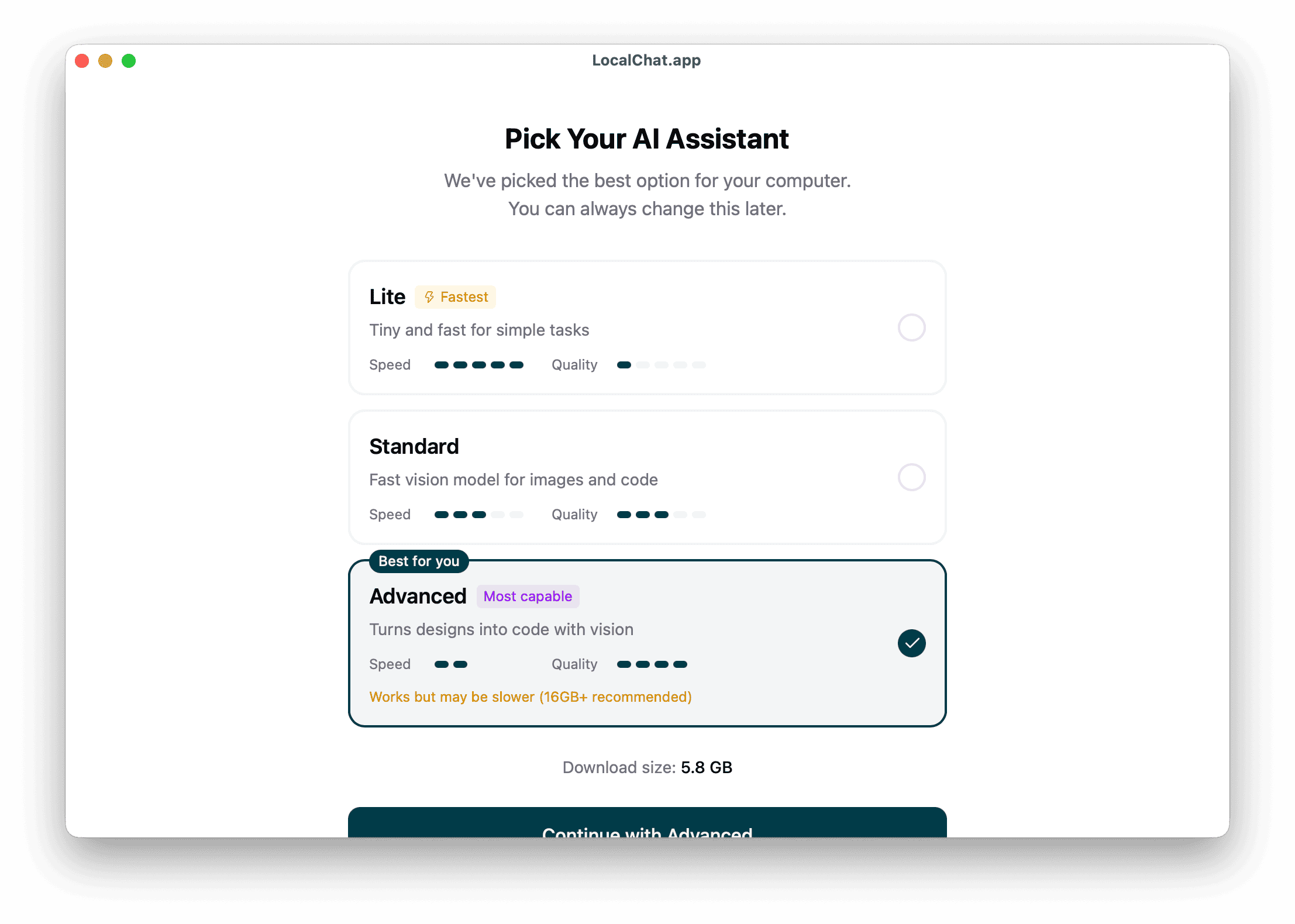 LocalChat highlights the recommended option for your system. You can always download additional models later.