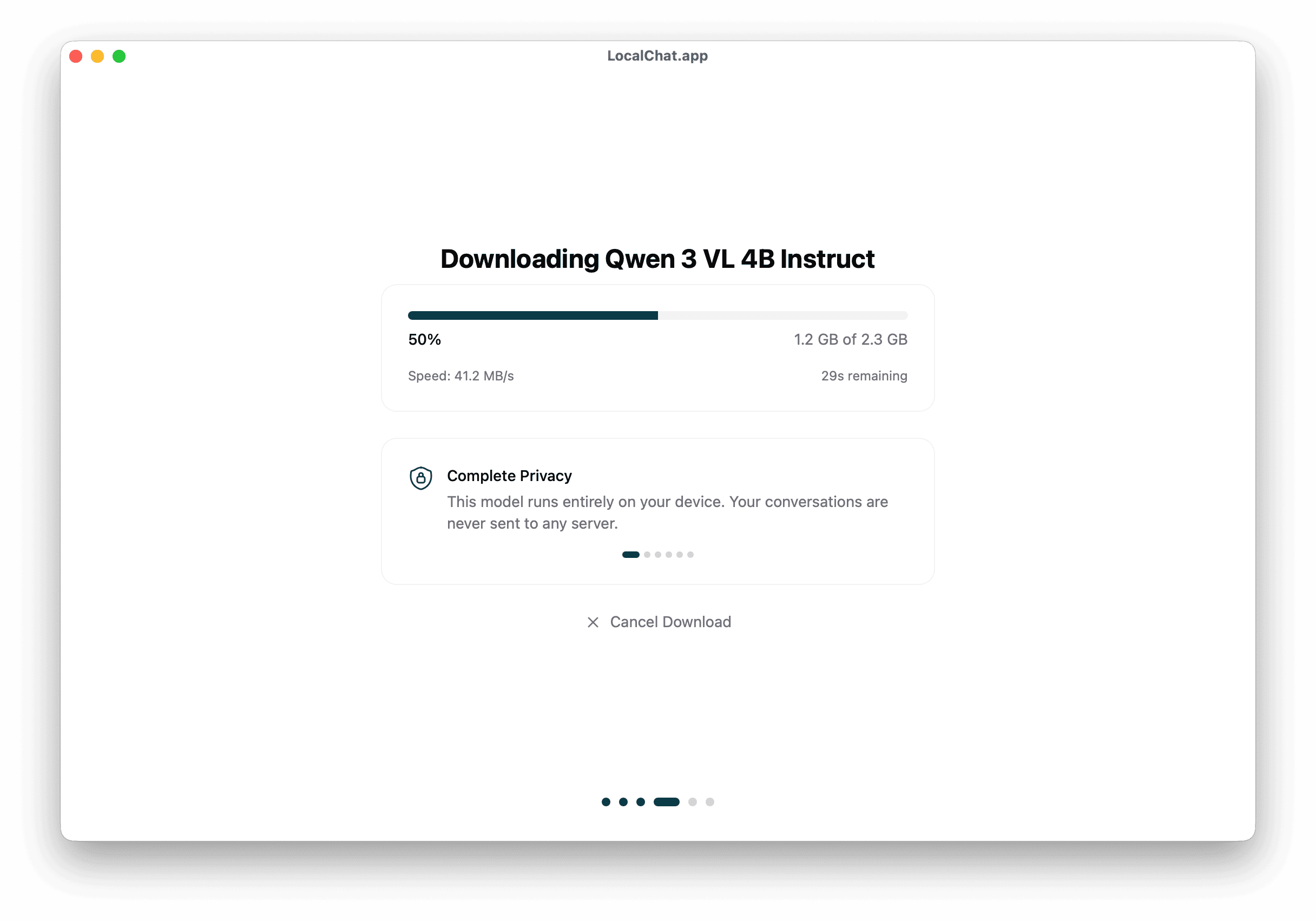 The model downloads to your Mac. Download size varies by model (typically 2-6GB). The screen shows: