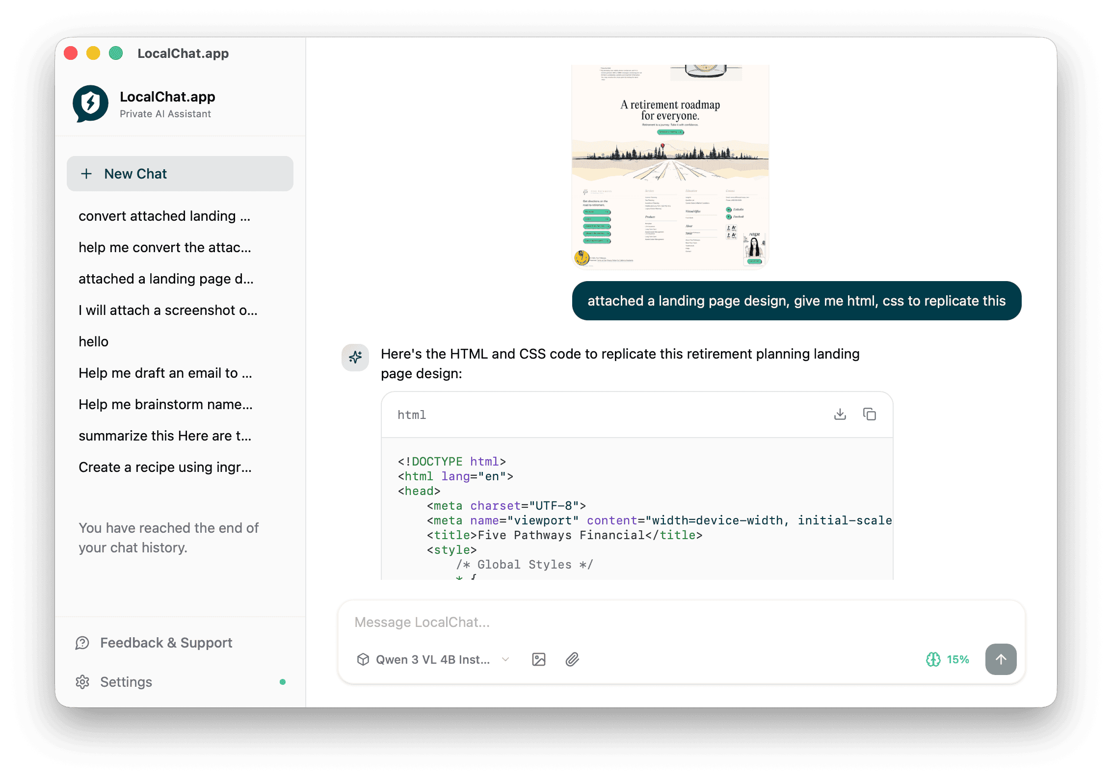 LocalChat can convert website screenshots and design mockups into working HTML and CSS code. Use vision-enabled models to turn visual designs into code you can use.