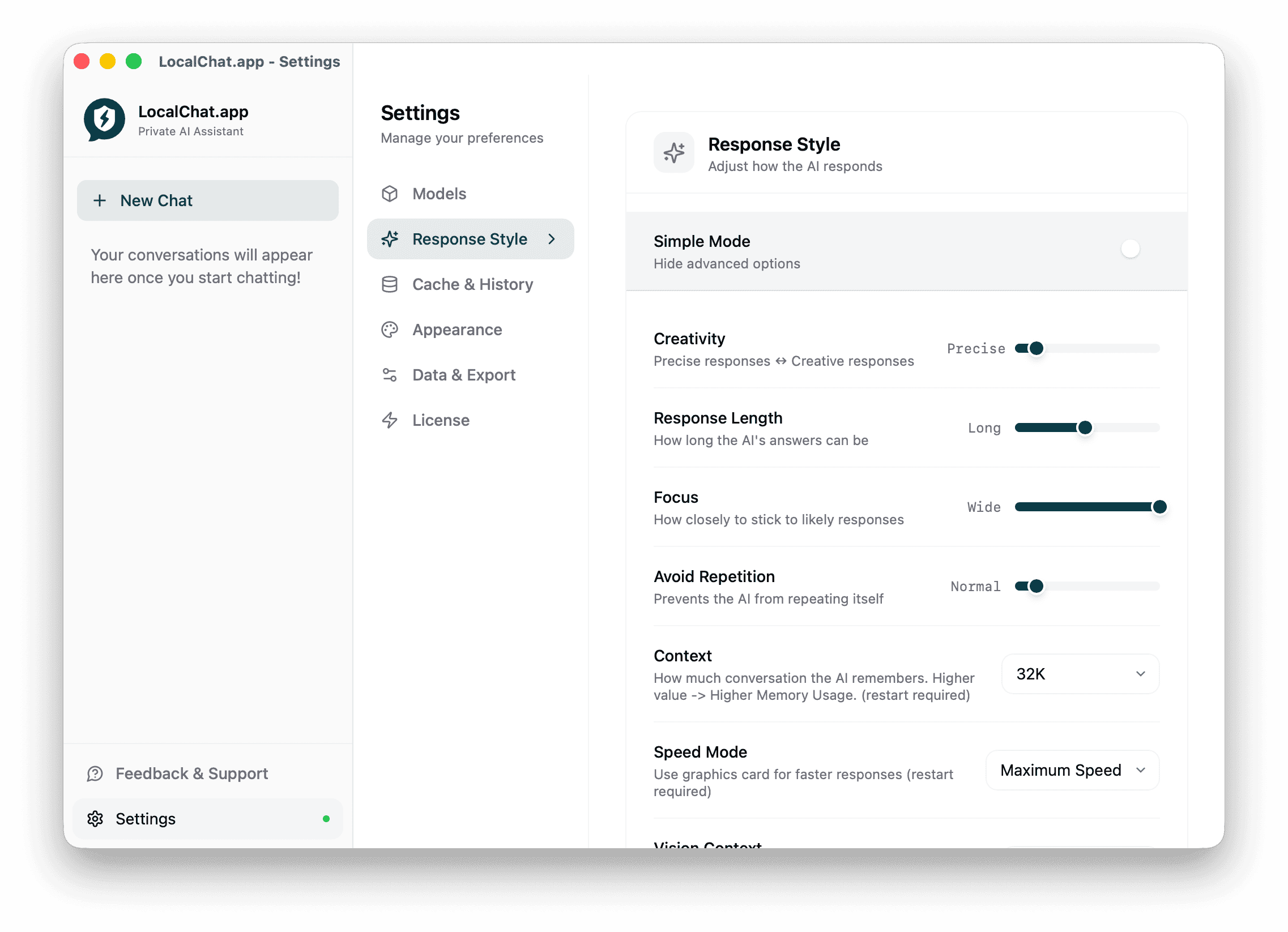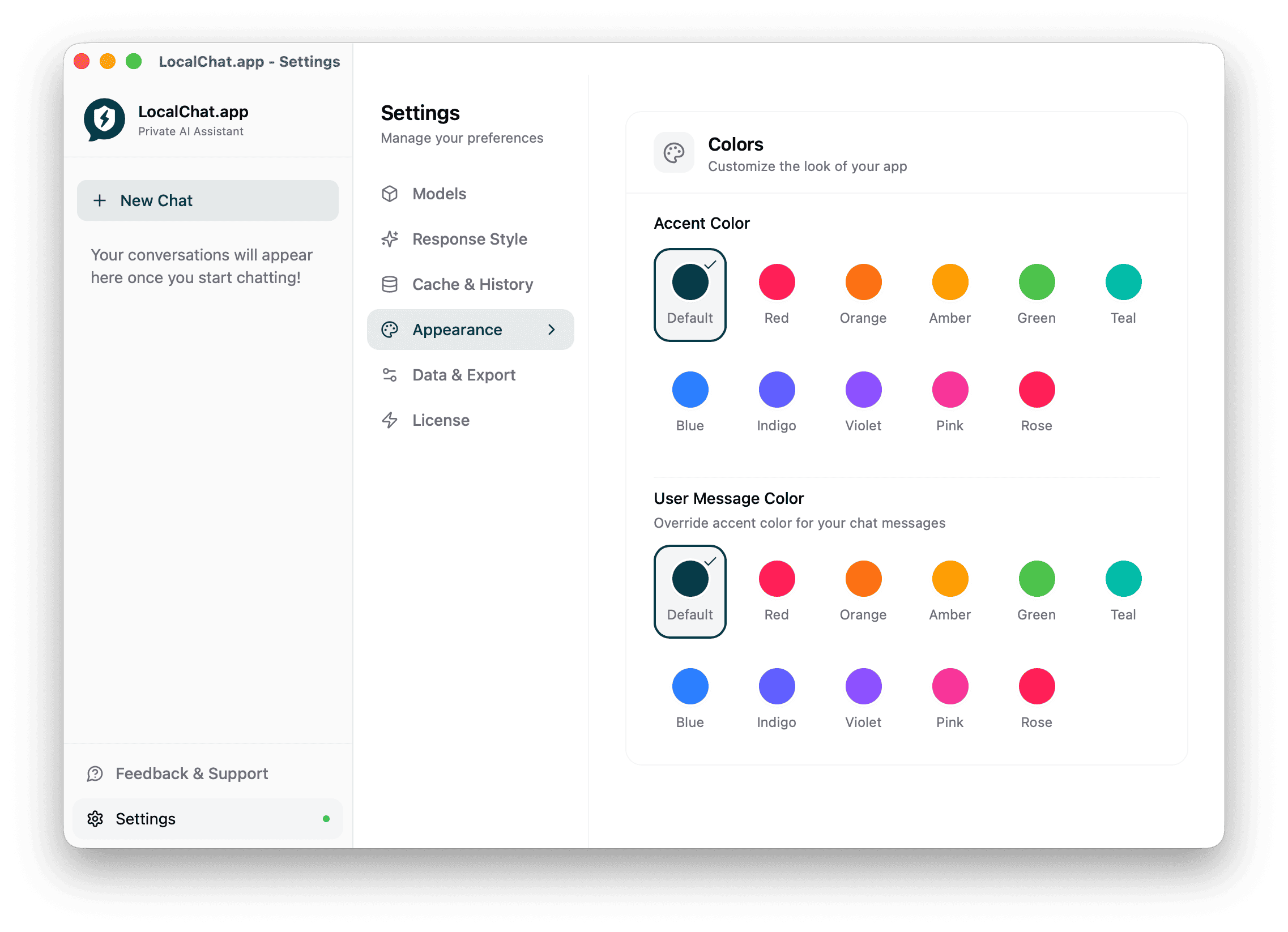 Customize LocalChat's behavior, appearance, and AI response style.