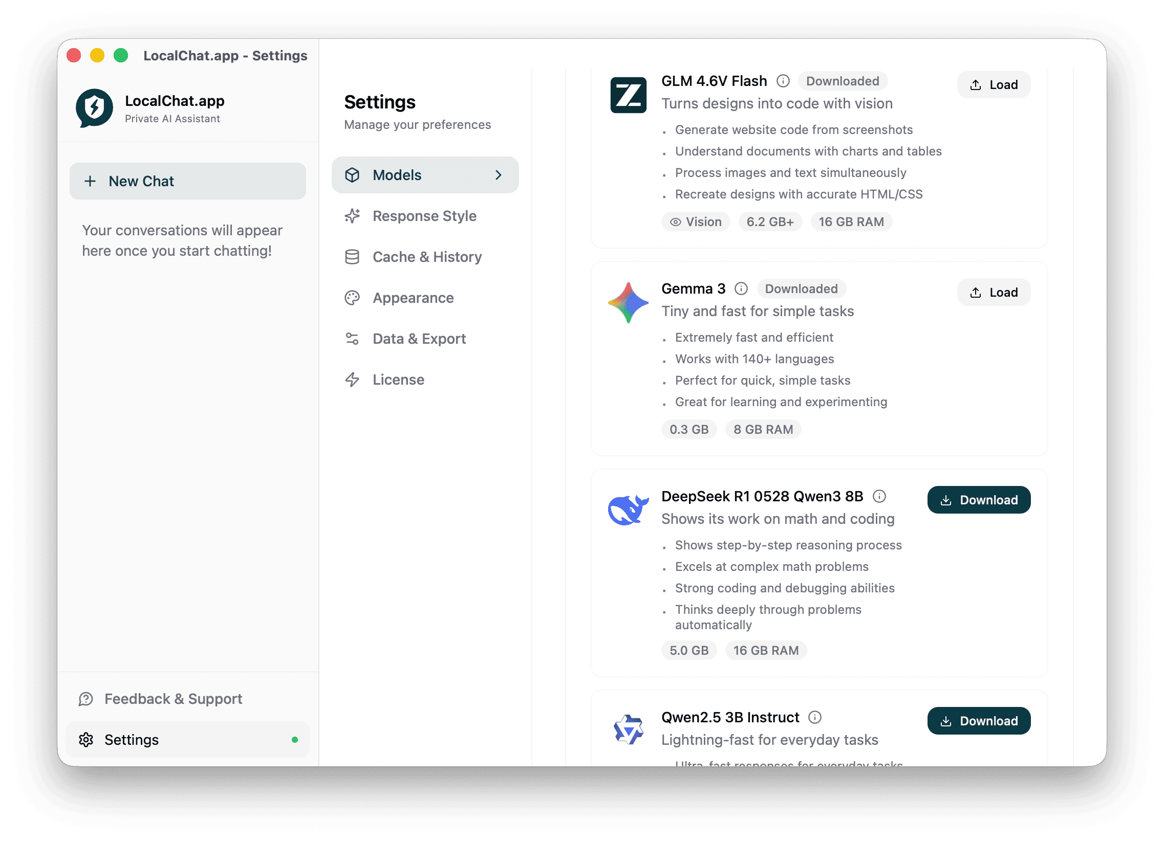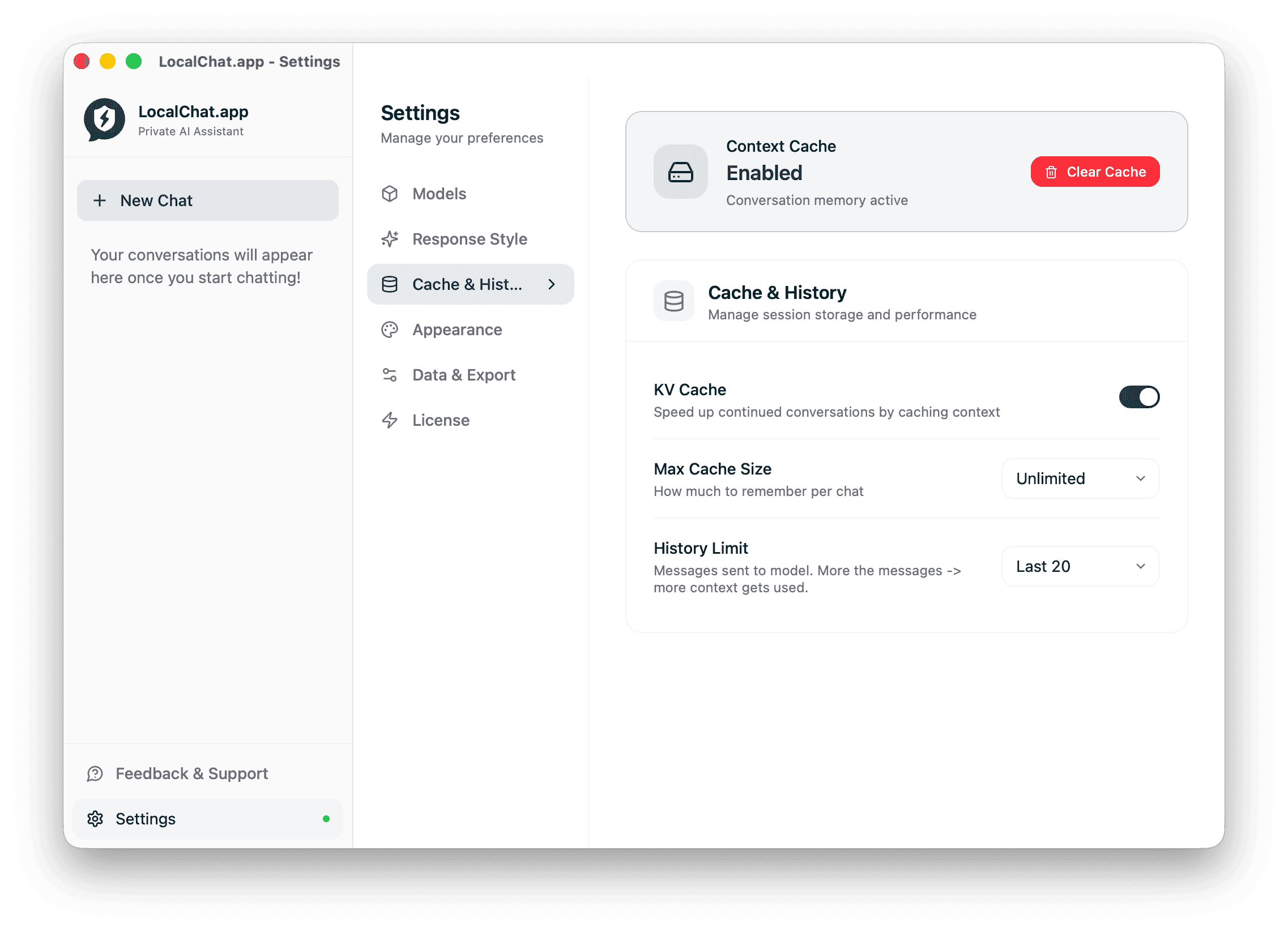 Settings are organized into six categories: Models, Response Style, Cache & History, Appearance, Data & Export, and License.
