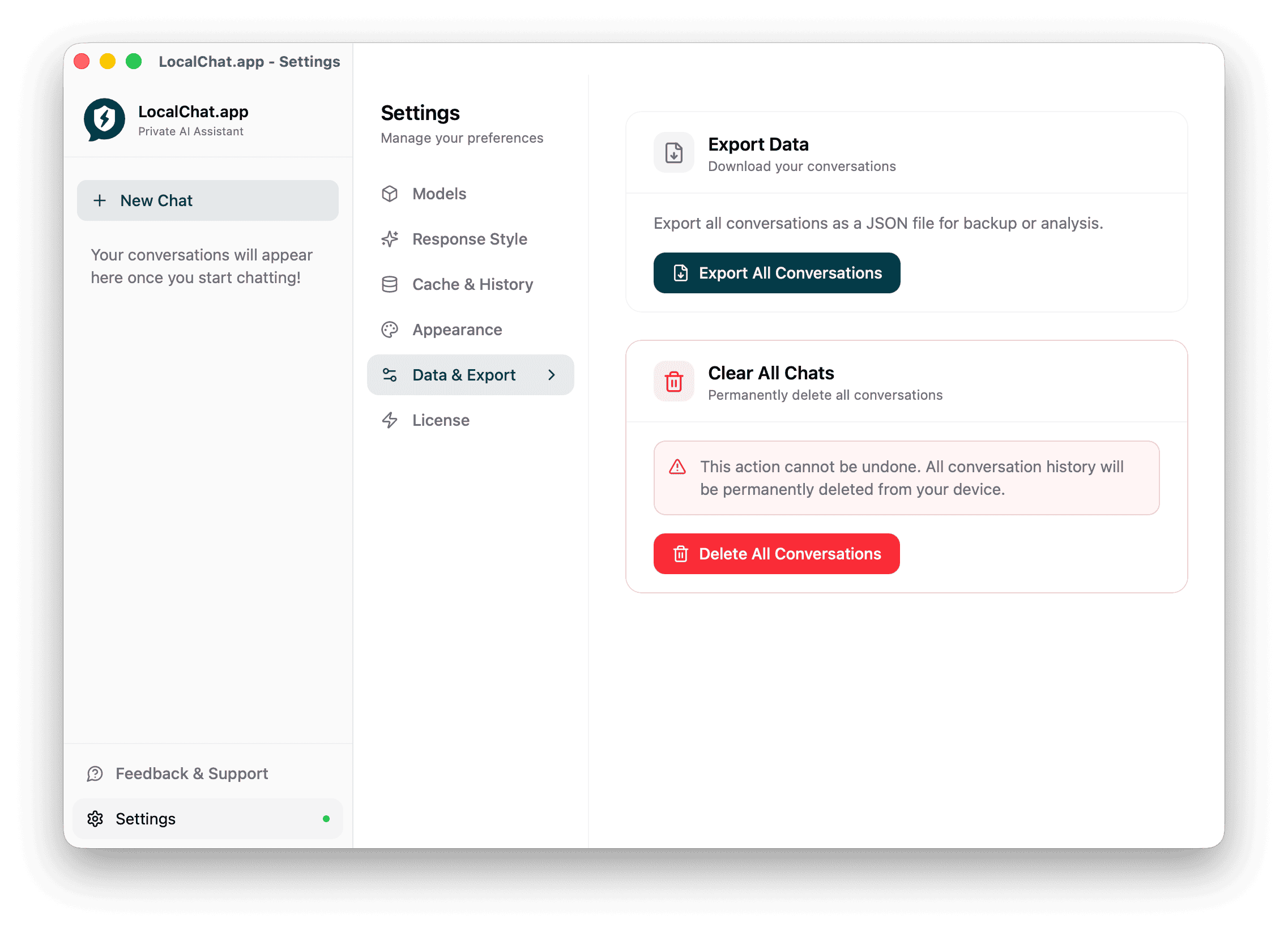Permanently delete all conversations from LocalChat.